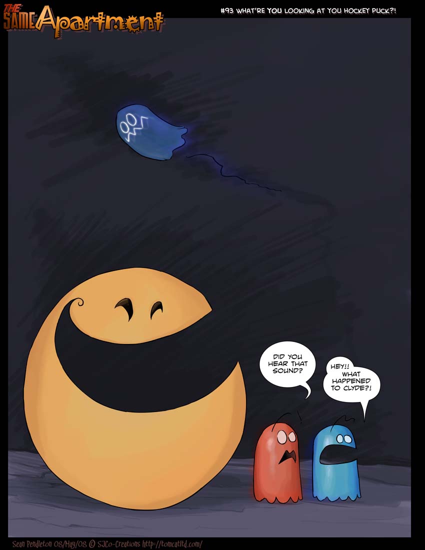 This started out as a random doodle. It was a funny enough at the time I think. Had some fun coloring this one what with the ghosts being a bit translucent. And of course Clyde, who’s clear and glowing.