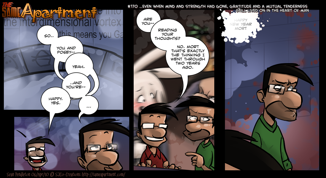 Sorry about the lateness guys and gals, it's been a wild and wacky week. Hopefully now that my schedule isn't bouncing around I'll be able to get some work done on the comic. For that last week, it's been work and sleep and that's pretty much it.. I hate when that happens, because this arc was so well planned out. As Ian Malcolm said: Life kicked the comic in the teeth. Or something.. ON TO THE COMIC: The idea behind this parallel universe is that Mort and Posey have been together for roughly two years starting after the Dreamers arc. I wanted to make this more of a plot point, but it started to get a little extraneous. I needed a quick background I thought to put a panel from SA 074. Looking back on that one, I actually still like the coloring for that one. That's rare.